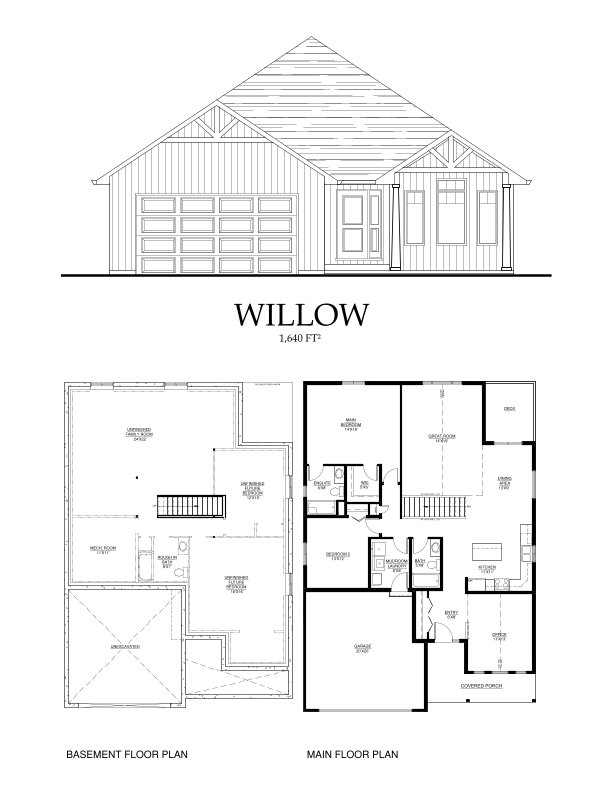 The Willow bungalow offers 1,640 sq ft of well-planned, comfortable living space with 2 bedrooms and 2 bathrooms. The primary suite features a spacious walk-in closet and a private 3-piece ensuite, complemented by a 4-piece main bathroom for guests or family.